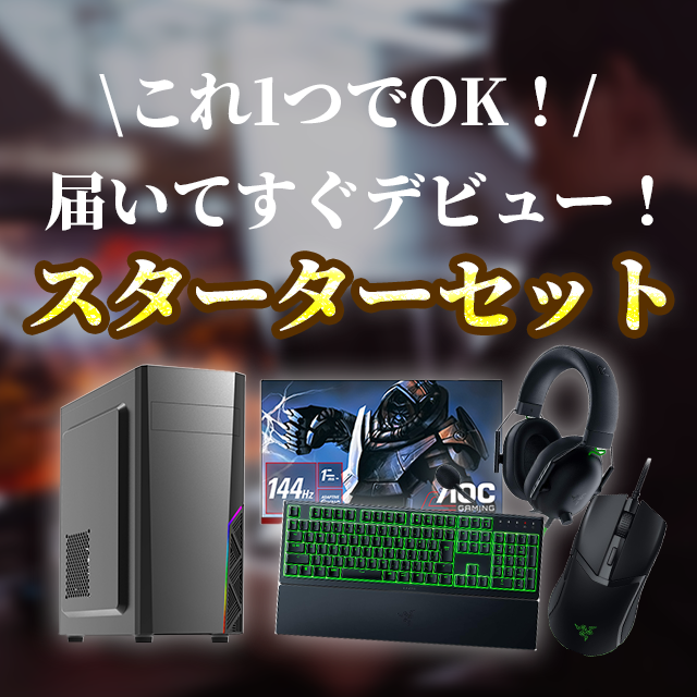 ゲーミングPCとモニター、キーボード、マウス、ヘッドセットがセットになっているオールインワンセット!PC初心者の方にオススメです